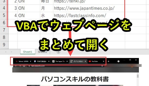 よく使うウェブページが複数あるとき、一つずつ開いていると面倒です。 また毎日確認したいページもあれば、曜日ごとに更新されるページもあります。 そこでエクセルであらかじめ設定した頻度に応じて、一括でウェブページを自動で開く … 続きを読む VBAでエクセルに入力した複数ウェブリンクをGoogleChromeで一括で開く